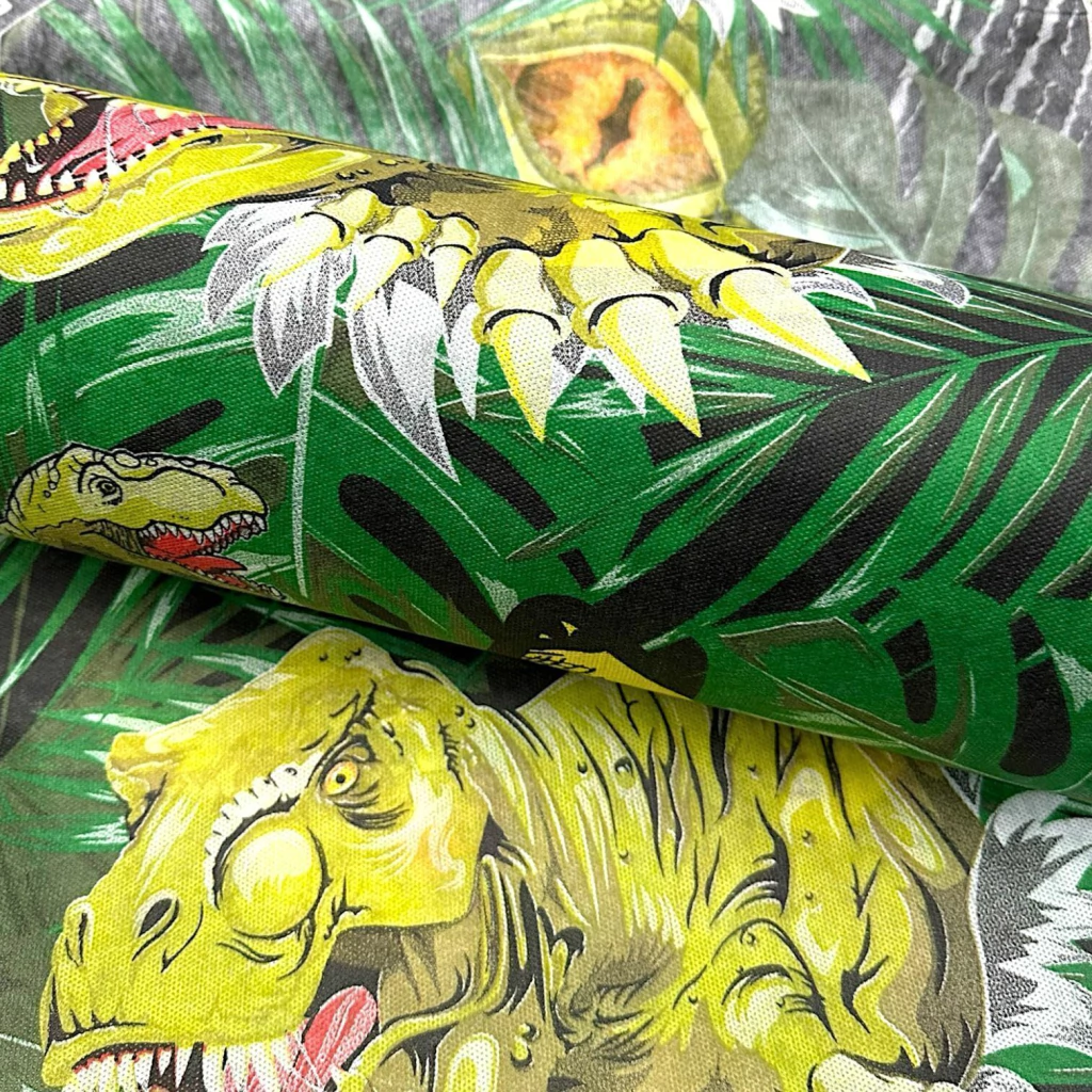 Estampa temática de dinossauro, perfeita para festas infantis.
