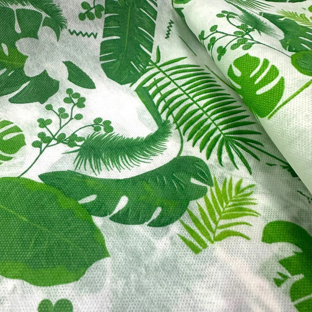 O TNT com estampa de folhagens verdes em fundo branco é leve, versátil e traz um toque natural à decoração.